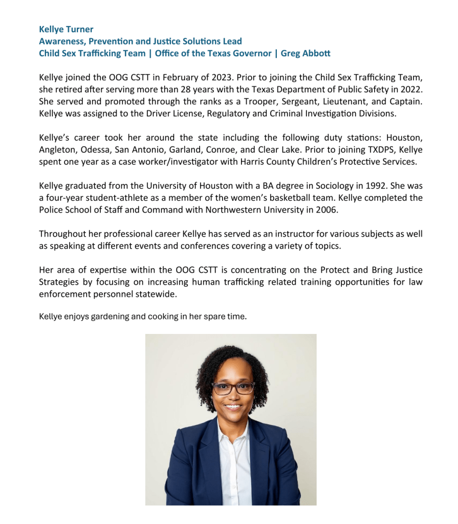 Keynote address: Kellye Turner (Awareness, Prevention and Justice Solutions Lead, Child Sex Trafficking Team, Office of Governor Greg Abbott)