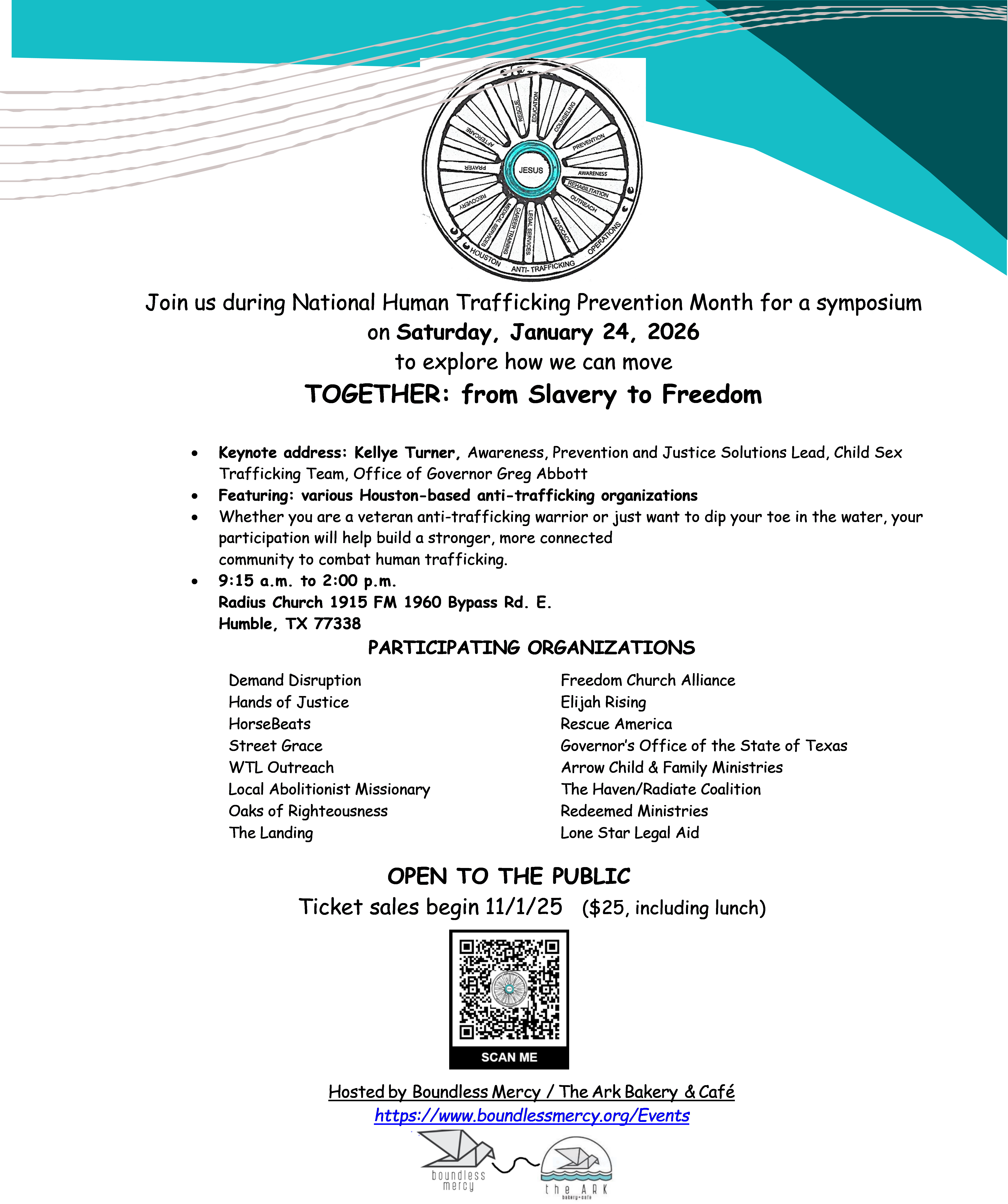 Education, awareness, and collaborative partnership are our goals. Whether you are a veteran anti-trafficking warrior or just want to dip your toe in the water, your participation will help build a stronger, more connected community through increased awareness, volunteer opportunities, and collaboration. Register here to purchase your ticket(s): https://boundlessmercy.ticketspice.com/together-from-slavery-to-freedom